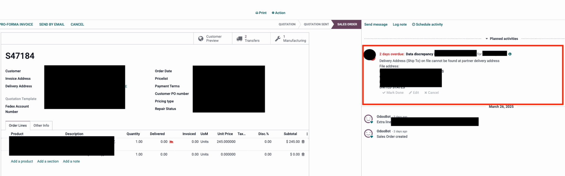 - Išgauti duomenys naudojami automatiškai sukurti pardavimo užsakymus (SO) „Odoo“ sistemoje.