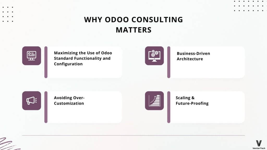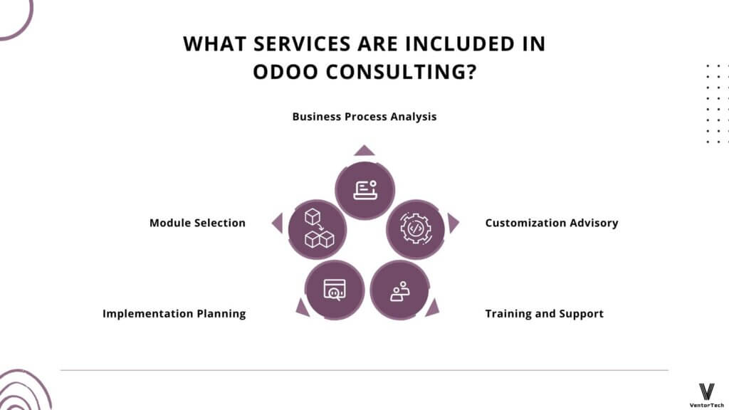 Konsultavimas yra esminis veiksnys, padedantis suderinti konkrečios įmonės poreikius su ERP sistemos galimybėmis. Tai leidžia priimti pagrįstus sprendimus dėl tinkamiausių technologinių sprendimų pasirinkimo ir jų efektyvaus panaudojimo. „Odoo“ konsultantai atlieka išsamią verslo procesų analizę, nustato silpnąsias vietas ir, remdamiesi šia analize, padeda suformuoti aiškų reikalingo ERP funkcionalumo vaizdą. Be to, jie prisideda prie verslo tikslų ir strateginių prioritetų išgryninimo.