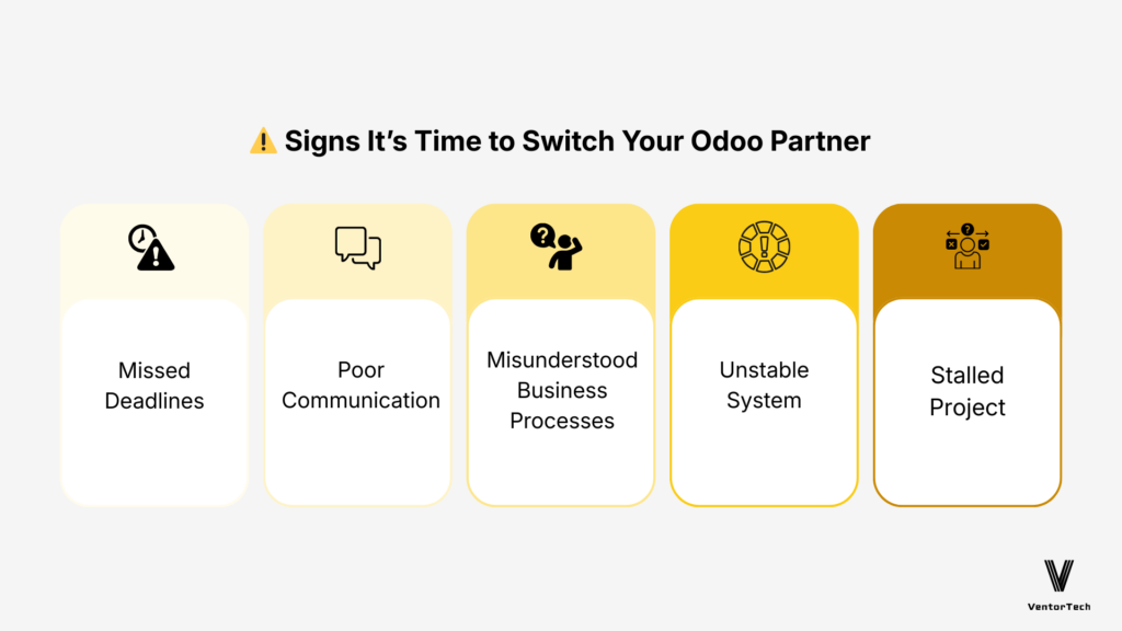 Santrauka: Straipsnyje paaiškinama, kada įmonei iš tikrųjų reikia keisti savo „Odoo“ diegimo partnerį. Jame aptariami įspėjamieji ženklai, rodantys, kad pokytis gali būti būtinas, su partnerio keitimu susijusios rizikos, kaip kuo sklandžiau įgyvendinti perėjimą, į ką atkreipti dėmesį renkantis naują partnerįį.